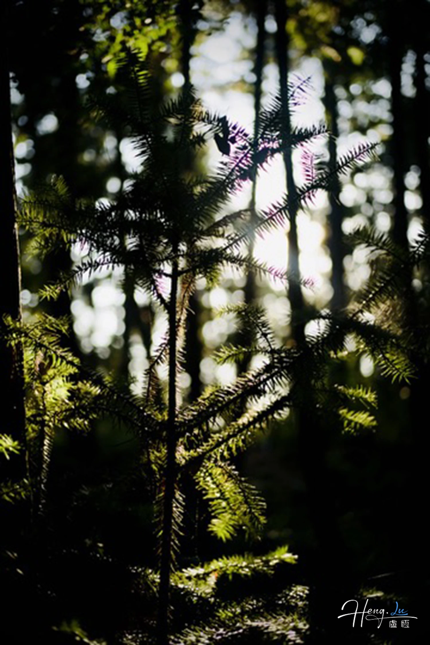The image captures a serene forest scene bathed in soft, diffused sunlight piercing through tall, slender tree trunks. In the foreground, a young coniferous tree with vibrant green needles stands prominently, its branches spreading symmetrically and catching the light in delicate highlights. Behind it, mature trees rise vertically, their dark trunks creating strong vertical lines that draw the eye upwards towards the canopy. Golden sunlight streams in from the upper right, forming radiant beams and lens flares that illuminate the foliage, producing a dreamy bokeh effect with soft orbs of light in the background. The interplay of light and shadow creates a mystical atmosphere, with areas of deep shade contrasting against the glowing greens and warm highlights. The dense woodland feels tranquil and untouched, evoking a sense of peace and natural beauty. Subtle purple hues from the light flares add an ethereal touch to the predominantly green and golden palette.